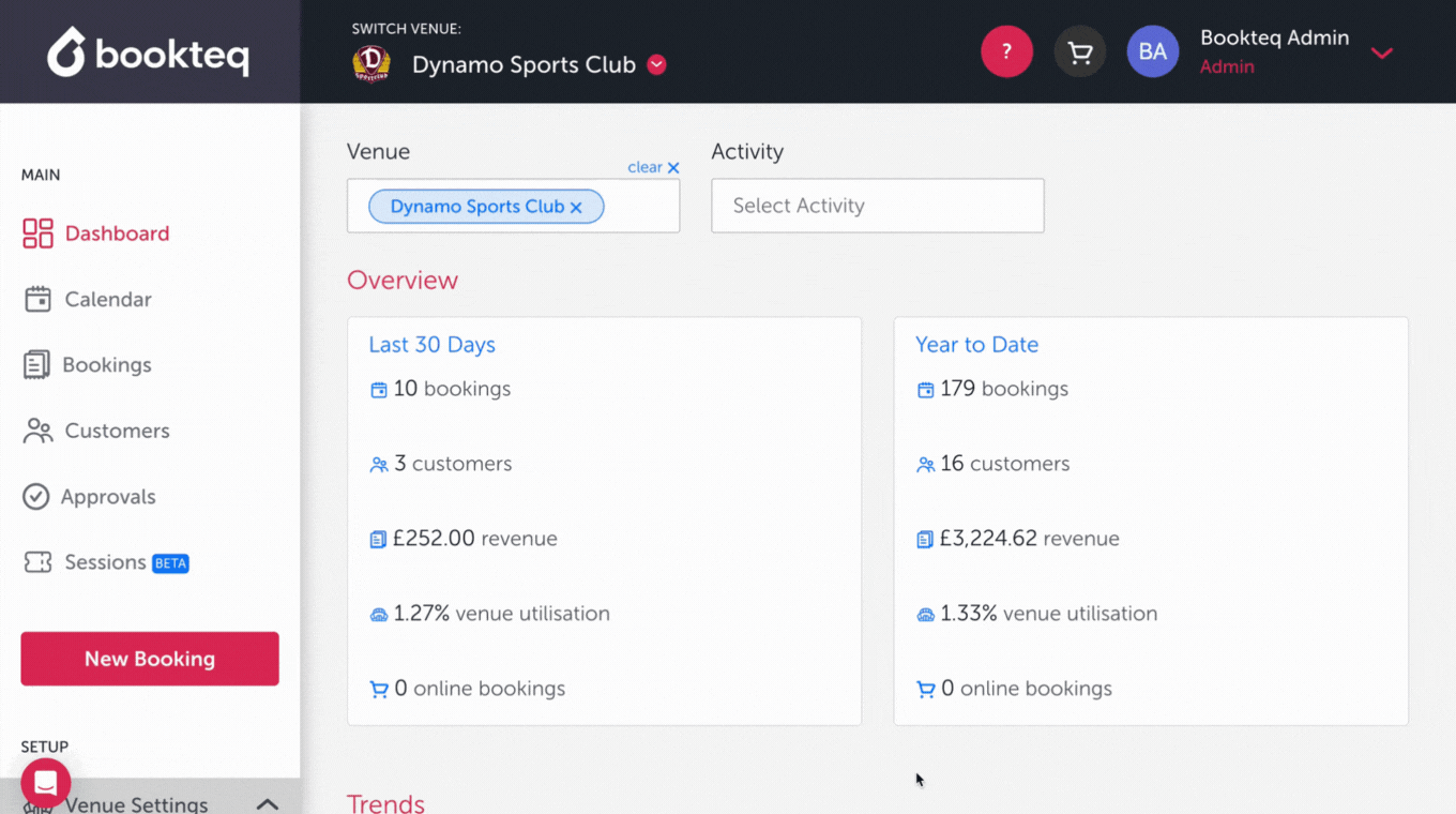 Track each facility’s utilisation and financial performance real time. For multi-site venues, you have a filterable multi-site dashboard.