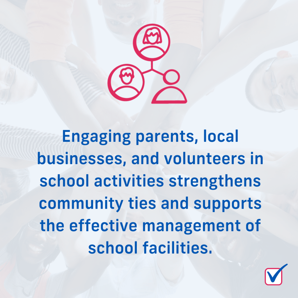 Community Involvement and Access: Engages parents, local businesses, and volunteers to support the effective management and utilisation of school facilities. This includes organising community events, forming partnerships for resources and support, and establishing volunteer programs to enhance school activities and facilities.
